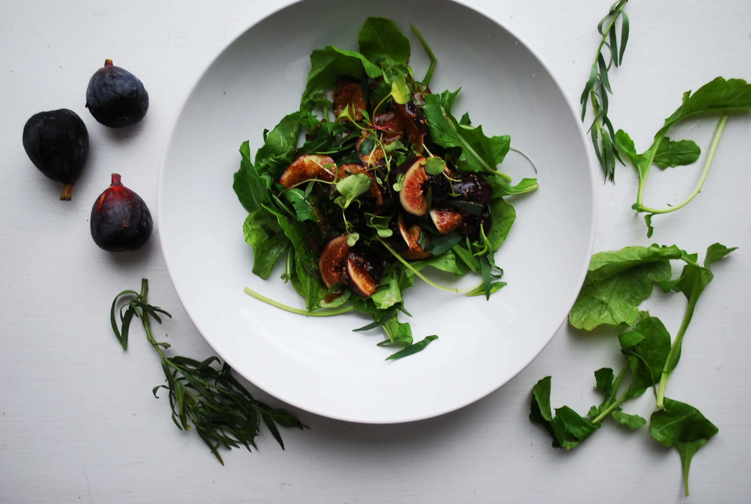 4. PLACE ARUGULA IN BOWL AND TOP WITH ROASTED FIGS AND MICROGREENS